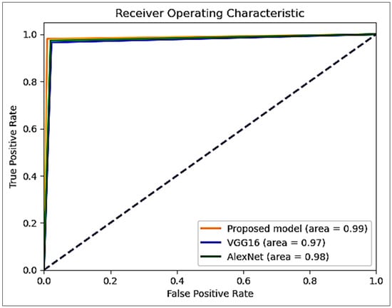 ROC metrics for the proposed model, AlexNet, and VGG16.