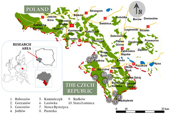 For detailed analysis sites (cemeteries and churches) located in Kłodzko Land (Terra Glacensis), in the counties of Kłodzko and Kamienna Góra, Lower Silesia, Poland were selected. In each of the villages there is a cemetery, and within it a church. The research area is located in the southern part of Poland and since 1945 it has belonged to the Polish state. As a border area, its history was shaped by Polish and Czech influences [49,50,51].