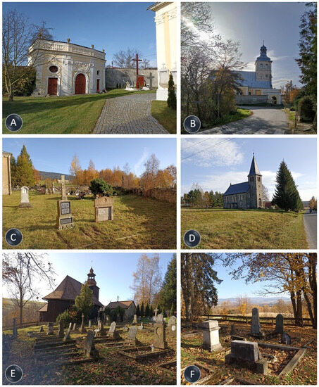 Distinctive landscape elements of the analyzed sites: (A) Baroque chapel in the cemetery in Gorzanów; (B) the church in Gorzanów; (C) historic tombstones in the cemetery in Jodłowo; (D) neo-Romanesque church in Lasówka; (E) wooden Baroque church in Kamieńczyk; (F) view of historic tombstones and the viewpoint from the cemetery in Kamieńczyk.