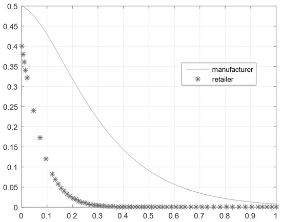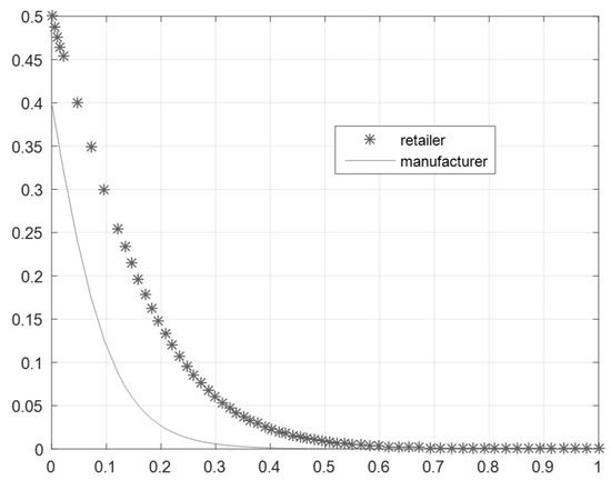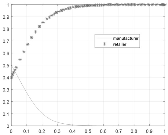 Let the unit production cost of traditional manufactured goods be . Production costs will decrease when adopting green technology: , where is the green manufacturer effort coefficient and represents the coefficient of the impact of green efforts on cost reduction. At this point, the manufacturer’s green technology investment cost is . Similarly, suppose the retailer’s green marketing effort coefficient is and the unit marketing cost of the product is , where represents the coefficient of the impact of green efforts on cost reduction. The marketing cost will be reduced when adopting green marketing: . The retailer’s investment cost of green marketing is . Without loss of generality, it is assumed that the fixed unit production cost and marketing cost of goods are 0.