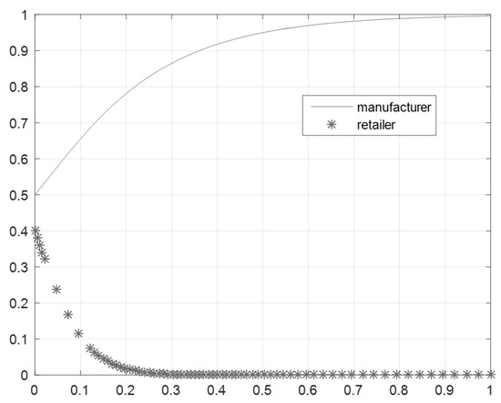 As shown in Figure 1, Figure 2 and Figure 3, when the network externality coefficient is high, manufacturers and retailers will choose green strategies. When the network externality coefficient is low, both manufacturers and retailers will choose traditional strategies. The reason for this outcome is that the compatibility of green products is generally greater than that of traditional products. For example, hybrid electric-petroleum cars can choose to either refuel at gas stations or charge at charging stations. As the sales volume of these hybrid cars increases, the number of charging stations also increases, attracting more consumers and further encouraging more traditional car companies to adopt hybrid green manufacturing strategies. Chen et al. also suggested that with increasing network externalities, the market size and profits of green products are following an increasing trend [50]. When the network externality coefficient changes, manufacturers will choose green strategies more quickly. This is because retailers plan to “hitchhike”. When the green technology of products is mature, little investment is needed to promote them. Retailers will observe whether green marketing strategies need to be adopted according to the manufacturer’s manufacturing strategies. Especially when the market demand is limited, retailers will not deliberately spend a large amount to promote green products, even though the manufacturer provides them.