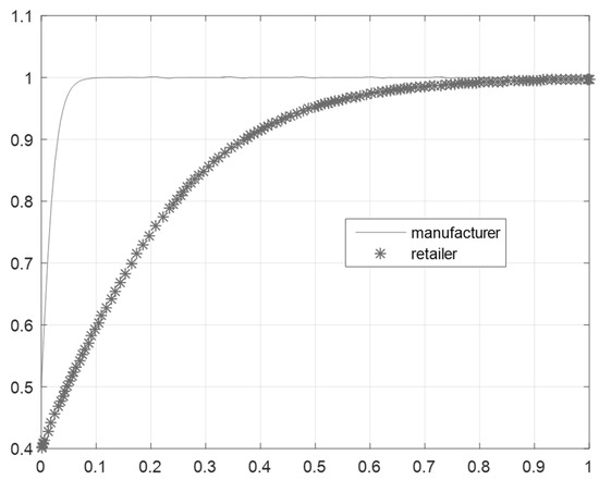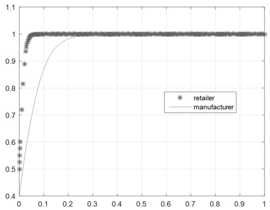 To further analyze the impact of the network externality coefficient on the choice of the green supply chain strategy, through simulation analysis, this paper draws the evolution track of the green supply chain when .