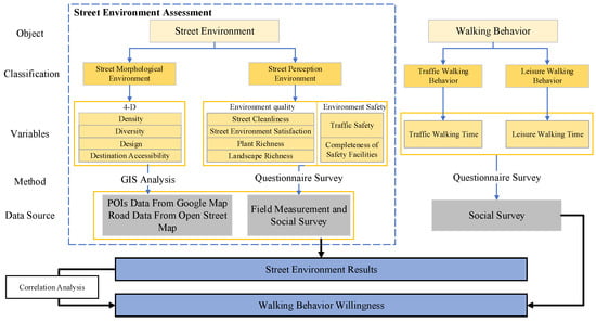 The framework indicates the research objectives, research variables, research methods and data sources, as shown in Figure 1. More specifically, the framework of the assessment method includes two dimensions of the street environment, walking time and four measures (street morphological environment, street perceived environment, traffic walking behavior, and leisure walking behavior). It should be noted that statistical analysis of density, diversity, design, and destination accessibility of environmental elements was implemented by GIS to avoid errors and complexity caused by manual calculation. Accordingly, factors such as street cleanliness, street environment satisfaction, degree of vegetation, and landscape were analyzed through questionnaire analysis to highlight the influence of pedestrian subjective intentions in the measurement process.