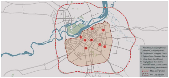 To comprehensively evaluate the impact of street environment in the old city districts on pedestrian behavior, eight streets in Nangang District, Xiangfang District, Daoli District, and Daowai District of Harbin have been investigated after field investigation and information screening as shown in Figure 2, including Qingbin Street (serial number) and Fanrong Street (serial number 4) in Nangang District, Situ Street (serial number 2) and Junli Street (serial number 1) in Xiangfang District, Heqing Street (serial number 6) and Minan Street (serial number 5) in Daoli District, and Nanwudao Street (serial number 7) and Daoyoufang Street (serial number 8) in Daowai District.
