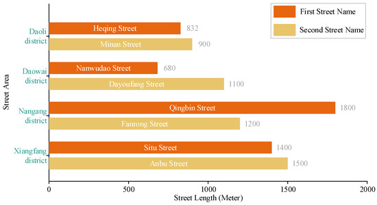On the one hand, the selected streets have a long construction time and relatively fixed form environment, and the environmental quality and environmental safety level of the streets are in line with the environmental characteristics of the old city district, with the street length ranging from 600 m to 1800 m, as shown in Figure 3. It can be seen that the shortest is Nanwudao Street, which is 680 m long, and the longest is Qingbin Street, which is 1800 m long. These streets cover various areas of Harbin’s old city district, and their long construction time makes them more suitable as representative street environments for each area. It is worth noting that the map in Figure 2 is from Google Earth, where the red dotted line in the outermost circle is the boundary of the main city district, and the dotted line in the innermost circle is the boundary of the old city district. The orange-shaded part in the image is thought to be the Harbin old city area. On the other hand, it is argued that living streets carry the daily public activities of residents, and their use as investigation areas is conducive to a more comprehensive analysis of the essential impact. In conclusion, in order to ensure that the survey area is a living street, the survey takes the center point of the selected street as the circle, the 15-min living circle as the radius, and selects the street with the highest proportion of POI related to the daily life of the residents in the area. In addition, the purpose of preferentially selecting streets with residents with large differences in age and social class is to increase the sample diversity.