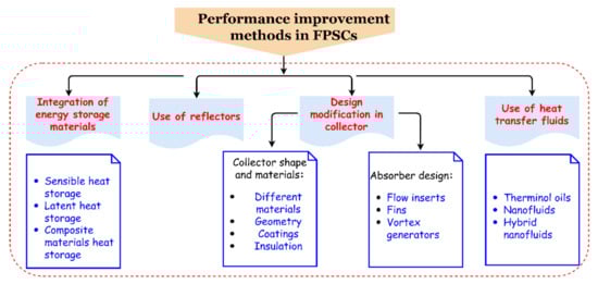 FPCs suffer from low thermal output issues due to poor heat transmission between the absorber surface and heat transfer fluid. Active and passive approaches can improve the low heat transmission rate. Generally, passive methods increase heat transmission from absorber tubes to HTF. Various researchers have used polymer absorbers, mini/microchannels for fluid flow, various absorber designs, energy storage materials, and nanofluids as working fluids to increase the thermal output of FPCs [4]. The heat transmission rate increased using devices such as twisted tapes, wire coil inserts, vortex generators, and various flow inserts. Different studies utilized reflectors to increase the solar energy flux, which will help improve the thermal output of FPCs [5]. Numerous research studies have used various kinds of heat transfer fluids (mono and hybrid nanofluids), such as aluminum oxides, Al2O3, CuO-water, MgO-water, etc., to increase the efficiency of FPCs. Recently, integrating energy storage materials with flat plate collectors has been a primary way to increase their thermal output by storing the heat energy in the late evening hours. It prompted the researchers to propose various performance enhancement methods with FPCs (see Figure 1).