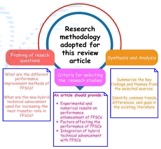 This review adopts a systematic approach to consolidate current studies investigating the incorporation of phase change materials (PCMs) and other performance augmentation techniques in FPCs, focusing on energy, heat transfer, and economic perspectives. The Scopus database and relevant keywords show a consistent growth in publications related to the use of PCMs in FPCs since 2015. The systematic literature review process is detailed, emphasizing the importance of minimizing bias to generate more reliable data for guiding research in this area. The research methodology adopted for conducting this review study is presented in Figure 2.