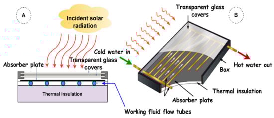 FPC is a unit that uses solar energy to produce heat output. The heat is used to produce hot air/water in buildings for heating, washing, and bathing. Mostly FPCs are utilized for low-medium temperature heating applications. FPC is an arrangement of an insulated metal box, an absorber plate, and working fluid flow tubes (see Figure 3). Glass or plastic glazing is used to diminish heat transfer losses. In these systems, the working fluid’s (air/water) temperature rises up to 80 °C. It comprises a copper/aluminum made plate. The plate is painted black or artificially formed (porous/corrugated) to improve the collector’s efficiency because the black color absorbs maximum solar radiation. Furthermore, two pipes are placed in the FPC; one is located at the top and the other at the bottom in a horizontal direction, called headers. Many shorter pipes are placed vertically in FPC, known as risers. The working fluid flows via risers and headers to gain heat energy from the absorber surface.