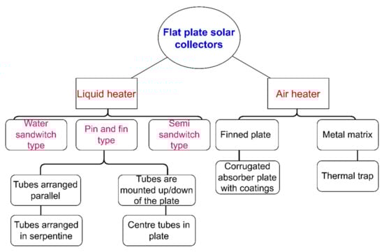 Flat plate collectors are significant for solar air/water heaters. The FPC is the least expensive and easiest to use among different thermal collectors. FPCs are mainly classified based on the working fluids, i.e., air heating and water heating. Figure 4 presents a detailed classification of the FPCs used for different applications.
