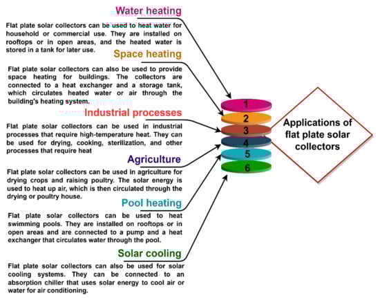 The broader applications of FPCs are presented in Figure 5. In FPCs, solar energy after absorption is transferred to an HTF (water/air/another substance) to meet the daily energy needs of an industrial process. Textile, rubber, paper, petroleum refineries, culinary, hospitals, chemical, and pharmaceutical industries all rely on solar thermal technology for one-third of their energy needs. Solar heat can be used in food for water/air heating, pasteurization, cleaning, cooking, and drying. So, by using FPCs, the consumption of fossil fuels can be reduced and save our environment from global warming.
