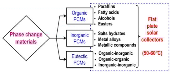 Thermophysical, kinetic, and chemical properties, as well as cost and environmental impacts, all play an important role in the selection of PCMs. Paraffin waxes, salt hydrates, and fatty acids are the three most common PCMs, which have been mainly used in solar thermal applications until now. Recently, a few researchers used some other PCMs and their mixtures for thermal energy storage applications in solar collectors. The most popular PCMs and their physical properties are shown in Table 1.