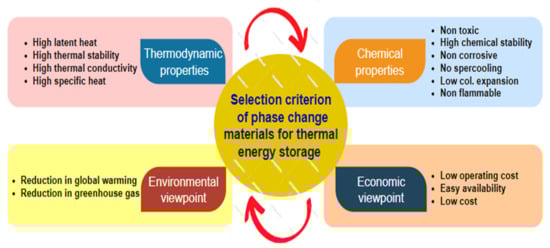 The ability of the phase change material (PCM) to efficiently capture and release substantial quantities of heat in a regulated manner can be harnessed for energy storage or for maintaining temperature stability within a specific range. This application enhances the thermal effectiveness of end-user products. Figure 7 displays the three major classifications of PCM that may be made based on their sources and properties: organic, inorganic, and eutectic. The selection of PCMs for a flat plate solar collector depends upon the following criteria outlined in Figure 8. By considering the above-outlined selection criteria, researchers can opt for the appropriate PCM for FPC to optimize its performance and efficient energy storage.