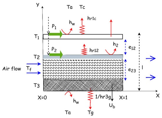 The FPC’s energy balance under steady-state conditions depicts how well the solar power is being transformed into valuable heat by determining optical and thermal losses. The thermal network and schematic of an FPC with glazing, which includes convection, conduction, and radiation as the main heat transfer phenomenon, are presented in Figure 6.
