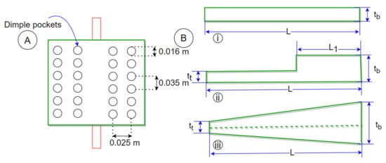 (A) Dimple pockets in absorber plate, adapted from [50] (B) Geometry of a regular heat transfer component (i) rectangular (ii) RPSLT, (iii) trapezoidal profile, adapted from [51].