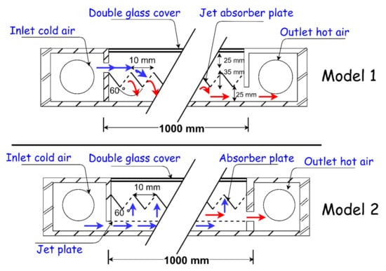 The findings showed that a trapezoidal shape was effective for maintaining a constant plate volume. The better performance and ease of manufacture make these profiles superior to others. Pandya and Behura [52] performed a study to assess the impact of both tilt angle and dust particles on the thermal output of FPCs. The study reveals that a rise in tilt angle from 15° to 25° resulted from an increase in the average thermal output from 27% to 30%. Additionally, the growth of dust on the glass surface led to a decrease in thermal output, from 30% to 20%, for a tilt angle of 25%. Kim et al. [53] analyzed the output of both existing FPC-based solar water heaters and a newly proposed one that makes use of a transparent polyurethane tube. Normal water, red, violet, and black colors were used in the new study. As per the results, the thermal output of an FPC-based SWH with black color is increased by 5% more than conventional collectors. To mitigate heat loss from the absorber, Garcia et al. [54] investigated the effectiveness of convective barriers inserted between the glass and the absorber of the FPC. Three convective barriers were chosen as the best options. Depending on the solar collector layout, the optimal number of convective barriers can shift. Utilizing three convective barriers at regular intervals decreased total heat loss by 5.25%. It is suggested to use two covers for an uncoated absorber plate, whereas a single cover is adequate for a coated absorber. Alomar et al. [55] used a v-corrugated absorber plate to improve the performance of an FPC-based SAH. They compared the thermal outputs of the altered and jet-plate-blown corrugated collectors. Model 1 is the modified system, and Model 2 represents the conventional system (see Figure 12).
