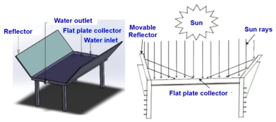 Recently, various researchers used different types of reflectors with flat plate collectors to effectively utilize solar radiation in many applications. Reflectors are optical components that use low-cost and suitable technology to focus light and increase the amount of solar energy. Generally, flat plate, linear Fresnel, CPC, and V-groove secondary reflectors, as well as other reflector designs, have been used to improve the FPC energy input. As per the literature, we know that the ∆T between the collector’s input and outlet kg/h directly correlates with the collector’s efficiency. Keeping this in mind, a reflector is introduced in the collector to focus global solar radiation, eventually increasing ∆T between the inlet and outlet water/air flow. Bollentin and Wilk formed a model and utilized it to calculate how much solar energy came into contact with the FPC in the reflector. It was reported that the use of reflectors caused a high solar radiation density flux [74]. In this study, reflectors in front of the FPC that increase solar radiation were used by the researchers. An increase of 10% was recorded for the yearly irradiation compared to the conventional collector [75].