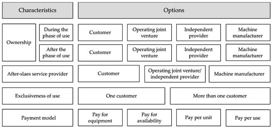 Based on the analysis of these two models and considering this study’s focus and purpose, a new morphological box was created for further investigation based on the four characteristics relevant to this study (see Figure 1): ownership, after-sales service provider, exclusiveness of use, and payment model. As the location of operation cannot be moved to any of the other options due to the type of industry investigated in this study, the location of operation is at the customer’s establishment; thus, the characteristic was not found relevant for inclusion in this study. The last characteristic excluded from Lay et al. [63] is the single/multiple customer operation. Lay et al. [63] explained that, in cases where the location of operation is in the customer’s establishment, only one customer can use the machine. However, if the machine is not operating in the customer’s establishment, the machine can serve multiple customers in parallel. In this study, the number of customers was replaced with exclusiveness of use, for which Kley et al. [64] included the sharing perspective of the vehicle and explained that the vehicle could be used by one customer or made available for several customers (e.g., via a car-sharing scheme).