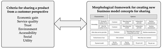The existing literature has put forth various typologies, strategies, frameworks, and tools to generate innovative business model concepts (e.g., Refs. [22,24,63,64,65,66,67,68]). Each of these proposals offers distinct perspectives and analytical approaches. A thorough analysis of the literature reveals that the morphological frameworks introduced by Lay et al. [63] and Kley et al. [64] are particularly suited for investigating the phenomenon at hand and warrant further exploration. These frameworks offer a visual representation and a classification scheme for key characteristics or attributes, thereby presenting a range of potential options to select and adopt diverse business model concepts. Notably, these two frameworks encompass crucial attributes that must be considered when facilitating business model concepts for the sharing economy within a B2B context, especially for industrial manufacturing companies.