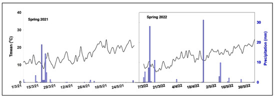 The climate of the region is Mediterranean. From the data recorded at the nearest meteorological station at Malevi Monastery, total precipitation in spring 2021 was 52.1 mm, whereas it reached 105.4 mm in spring 2022. The mean daily air temperature ranged from 8°C to 24.5 °C in spring 2021 and from 6°C to 23.9 °C in spring 2022 (Figure 2).