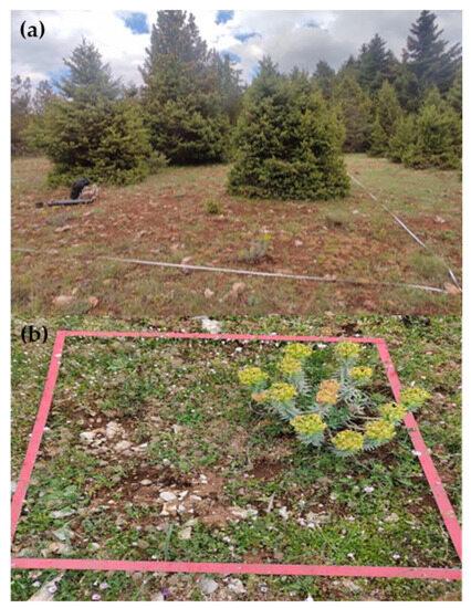 The sampling of herbaceous plant species was conducted at 10 sampling sites measuring 100 m2 in forest openings that were accessible in the spring seasons of 2021 and 2022 (Figure 3a) because plants are in their flowering and the maximum of their productive capacity (plant biomass). At each sampling site, the plant species were recorded in nine 1 m2 sub-quadrats within a 100 m2 quadrat (Figure 3b), and the species richness and number of individuals of each plant species and the total percentage of plant cover were measured [23]. To determine the plant samples, the“Flora Europaea” [24,25], the “Flora Hellenica” [26], and the vascular plants of Greece:an annotated checklist [5] were used. Life form, chorology, and status categories of plant species follow the system of Dimopoulos et al. [5,9] and Raunkiaer 1934 [27]. A total surface cut of all above-ground plant parts of nine 1 m2 sub-quadrats within a 100 m2 quadrat at each sampling site was then conducted and transported to the laboratory. All the plant species of each of 1 m2 sub-quadrat were placed in a drying oven (BINDER FED 400) at a temperature of 65 °C for 48 h, and the dry herbage biomass was then weighed on a precision balance to determine the dry weight [28].