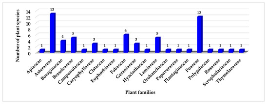 In the studied area, 63 plant species belonging to 58 genera and 20 families were identified (Figure 4). The most numerous families were Asteraceae (20.63%), Poaceae (19.05%), and Fabaceae (9.52%). The sites with the greatest number of plant species were S1 (21 species), S2 (23), S3 (23), and S4 (19), while the site with the fewest plant species was S10 (10). In addition, 88.89% of plant species are native/non-range restricted, whereas 11.1% are native/range restricted. According to the life form spectrum of the vegetation, therophytes (40.32%) contributed the most to the total number of recorded species in the study area, followed by hemicryptophytes (37.09%) and phanerophytes (1.61%). The documented species’ chorological spectrum revealed that Mediterranean species comprised 18.33% of the total flora, followed by paleotemperate species (13.33%). In addition, European–Southwest Asian (11.66%) and Mediterranean–Southwest Asian (11.66%) species were well represented. Appendix A (Table A1, Table A2, Table A3, Table A4, Table A5, Table A6, Table A7, Table A8, Table A9, Table A10 and Table A11) presents the plant species recorded at each site (S1–S10) on Mt. Parnon.