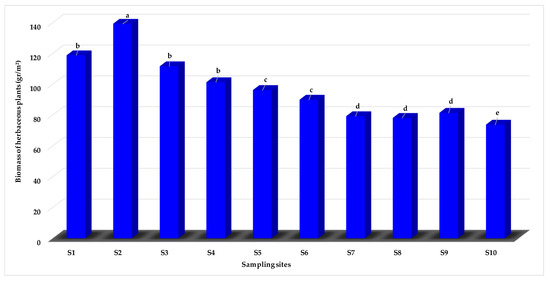 Figure 6 shows the mean produced biomass of herbaceous plant species (g/m2) on the S1–S10 sites. Significant statistical differences (F = 4.48 and p = 0.00) were detected in the produced biomass among the different sites of the study area. Specifically, the highest values were observed at S2, followed by S1, S3, S4, subsequently by S5, S6, and then by S7, S8, S9, while the lowest values were observed at S10.