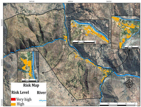 Ccopi-Trucios, D.; Barzola-Rojas, B.; Ruiz-Soto, S.; Gabriel-Campos, E.; Ortega-Quispe, K.; Cordova-Buiza, F. River Flood Risk Assessment in Communities of the Peruvian Andes: A Semiquantitative Application for Disaster Prevention. Sustainability 2023, 15, 13768. https://doi.org/10.3390/su151813768