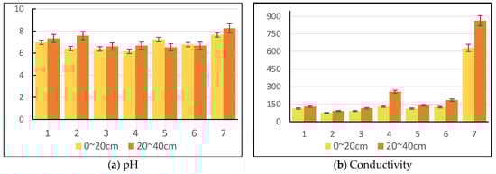 Electrical conductivity was determined by a conductivity meter where the water-soil ratio was 5:1. We placed 20 g of sample soil into a beaker flask of 250 mL, put 100 mL of distilled water into it, and took the filtering liquid out after vigorous stirring conditions. Then, the electrical conductivity of the liquid was measured through the conductivity meter at room temperature.