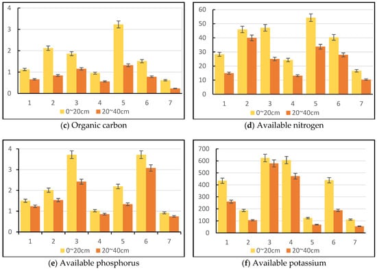 Table 6 presents a comprehensive evaluation of the impact of different methods. According to the results, the overall properties of topsoil are better than those of subsoil. With the increasing depth of soil, soil fertility gradually decreases. Among the examined revegetation methods, Method 5, Method 3, Method 2, and Method 6 exhibit a notable capacity to effectively enhance soil development. On the other hand, the effectiveness of the remaining two methods, Method 1 and Method 4, is comparatively lower. These findings underscore the crucial role of revegetation methods in influencing soil quality, with certain methods showcasing higher efficacy in promoting improved soil conditions compared to others.
