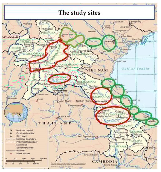 Lao People’s Democratic Republic (Lao PDR) is a landlocked country at the heart of the Indochinese Peninsula in Southeast Asia. It shares 505 km of border with China to the north, 435 km of border with Cambodia to the south, 2069 km of border with Vietnam to the east, 1835 km of border with Thailand to the west, and 236 km border with Myanmar to the northwest [1]. The country can be divided into lowland and upland/sloping land zones. Lowland areas—called the Mekong Corridor—are mainly along the Mekong River. Agriculture in the Mekong Corridor areas is becoming more and more market-oriented, with market forces driving the process of agricultural intensification and diversification. Upland villages are more remote and have poorer road and market access, and villages rely predominantly on subsistence farming [2].