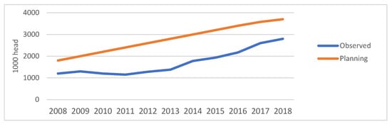 During the period between 2008 and 2018, the total number of goats and sheep produced in Vietnam increased from 1.2 million to 2.8 million heads, with an average annual increase of 8.2%. This demonstrates that goat and sheep production has been very relevant in Vietnam recently. However, the total number of sheep was less than one million in 2018, which was lower than the planned development to reach 3.7 million heads of goats and sheep (Figure 2).
