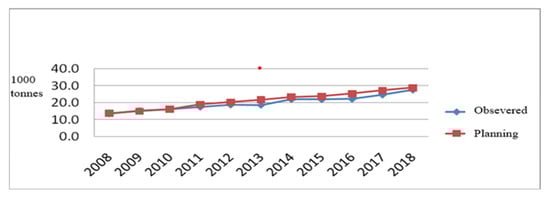 From 2008 to 2018, goat and sheep meat production increased from 13.5 to 27.5 thousand tons in Vietnam, with an average annual increase of 5.5% (Figure 4). After the period of restructuring animal breeding, some provinces selected goats and sheep as the dominant animals for their areas; hence, the meat production was mostly close to the development orientation number.