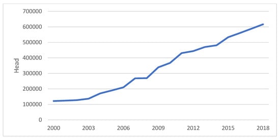 In Laos, the free-range system is applied, and goats are grazing all year freely in small groups in the forest and fallow land in mountain areas, as reported by Gray et al. [15]. The Lao Ministry of Agriculture and Forestry established a Livestock Development Plan [57] in which livestock production is expected to be strengthened and promoted. Historically, goat numbers in Lao have been low but have increased rapidly in the last two decades from 121,700 heads in 2000 to 616,325 heads in 2018, an increase of 506.4% (Figure 5). The relatively high rate of increase in the goat population in Laos has been due to a good local market demand for goat meat [15]. In addition, Gray et al. [15] indicated that this growth was driven primarily by an increase in the demand from Vietnam due to both human population growth of 19% in 2000–2016 and, more significantly, a 228% increase in GDP per capita over the same period.