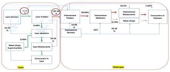 Information was collected from 400 respondents, 265 from Laos and 135 from Vietnam, of which there were 221 farmers in Laos, including Khammouane (59), Luang Prabang (65), Savanakhet (83), Viettiane (14); 36 traders: 7 in Laos and 29 in Vietnam; 36 slaughterhouse owners: 15 in Laos and 21 in Vietnam; and 107 restaurant owners: 22 in Laos and 85 in Vietnam (Table 2).