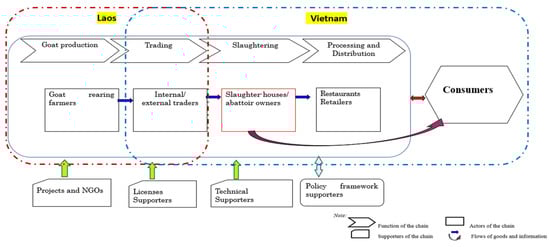 Research on goat value chains in Bangladesh by Barua et al. [48] found that farmers had little knowledge of goat farming, and the actors were not working well while the stakeholders did not supply enough support for a standard goat chain. Dube et al. [49] analyzed the goat value chain in Zimbabwe and showed that the goat chain included six major functions from input supply, production, trading, slaughter/processing, retailing, and consumption with many stakeholders to support the chain. Being free of disease and the animal’s condition, age, weight, and the color of its meat were the most important attributes of value chain actors. Producers faced many challenges in the development process. According to Hussen et al. [50], in the goat value chain in Ethiopia, there were five major functions in the chain from input supply, production, marketing, processing, and consumption. There were five domestic marketing channels with three live goat export and four goat meat export channels. The vertical linkages were mainly based on verbal contracts while the horizontal linkages were limited among export abattoirs and small traders. Export abattoirs seemed to have the most power along the chain.