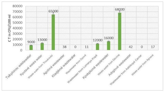 Research and enumeration of fecal streptococci: Figure 5 shows the results of the SF enumeration of the wastewater sampled. The maximum detected values of these germs were 47.000 CFU/100 mL and 45.000 CFU/100 mL in Loményokopé and Tsikplonou, respectively. The lowest concentrations were recorded in the wastewater from Adzové and Agnavé.