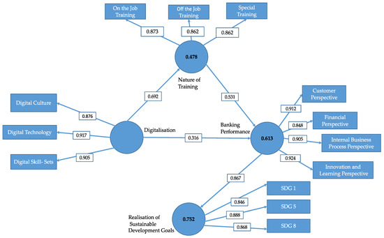 | H4: Banking performance → realisation of specific sustainable development goals (SDG1, SDG5 and SDG8). | β-value 0.867 | 0.000 *** | Supported |