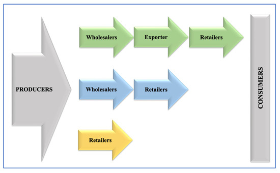 Based on the research results, it was clear that producers had the highest net profit margin in all FTSCs. This finding confirmed the results of previous studies conducted by [50,51,52]. In contrast, some previous studies reported that net profit margin of the producers was the lowest [53,54]. The net profit share of the producers decreased with the increasing number of intermediaries. The net profit share of producers exceeded that of the retailers in the third FTSC. This research finding corroborated the results of [52,55,56,57].