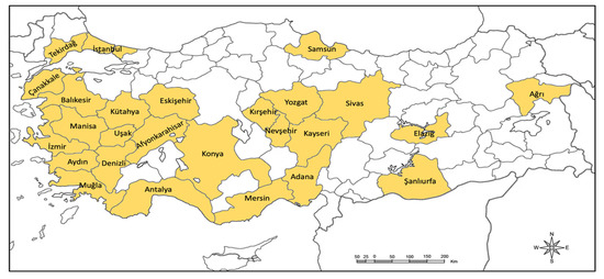 The distribution of Turkish greenhouse tomato farms.