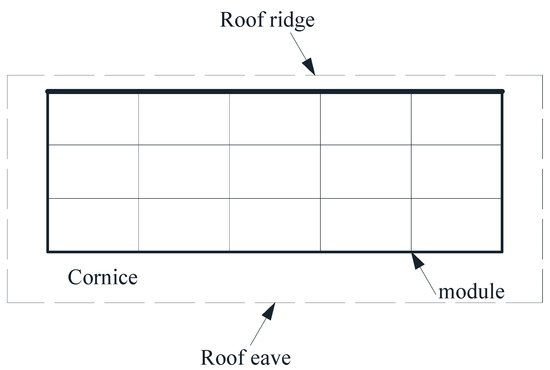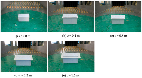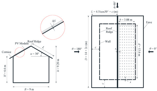 The solar module was mounted on a gable-roof, low-rise residential building, as shown in Figure 2. The building configuration included two parts, i.e., one fixed part -the main body, and one flexible part—cornices. The residential building featured a roof slope of 30°, plan dimensions of 9 m (=B) by 14 m (=D), an eave height of 6.6 m (=H), and a ridge height of 9.2 m (=h) in full-scale, which resulting a mean roof height of 7.9 m. The solar module, having plan dimensions of 4.8 m (=b) × 13.6 m (=d), was installed bilateral symmetrically, parallelly on the sloping roof. The clearance (∆S) between the lower surface of the module and the roof was set as 10 cm, which satisfied the Chinese executive orders that require the clearance between the lower surface of the solar module and the sloped roof to be less than 30 cm. The setbacks (s) from the edges of the solar module to the roof ridge, eave, and two ends were 0.2 m, respectively. Aly and Bitsuamlak [4] presented that solar panel modules experienced high net minimum pressures over roof corner and edge zones; thus, five kinds of cornices with lengths of 0 m to 1.6 m at an interval of 0.4 m were constructed, which represent narrow, medium and wide cornice. Thus, the length (L) of the building roof can be calculated as L = 4.5/cos30° + c (m). Gaps between individual modules were not considered in the model design, as solar modules are practically installed on purlins, and the gaps are blocked by purlins. The geometrical scale of the simulated flow and building model was 1/25. The maximum blockage ratio was less than 2%. Photographs of experimental models with cornice lengths (c) of 0 m, 0.4 m, 0.8 m, 1.2 m, and 1.6 m in the wind tunnel are displayed in Figure 3.