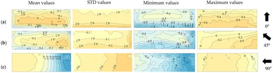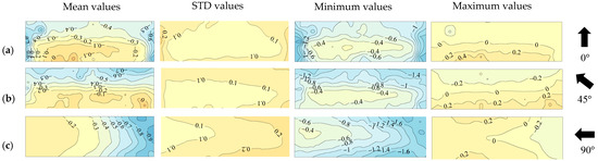 Figure 5 presents the distributions of mean, STD, and peak pressure coefficients on the lower surface of the solar module instrumented on the 30°-sloped gable roof. When θ = 0°, the area close to the roof eave experiences smaller mean pressure coefficients, while the area close to the roof ridge and edges experiences larger mean pressure coefficients, which is opposite of that on the upper surface. Larger minimum peak pressure coefficients also appear in the area close to the roof edge, which is different from that on the upper surface, where larger minimum peak pressure coefficients appear in the area close to the eave. This may be attributed to the accelerated wind flow exiting the cavity through the passage formed by the gable roof edge and solar module. When θ = 45°, the larger mean and minimum peak pressure coefficients also appear in the area near the roof ridge. The largest mean pressure coefficient reaches −0.7, which is approximately 75% larger than that observed on the upper surface. At the same time, the largest minimum peak pressure coefficient is comparable with that observed on the upper surface. When θ = 90°, the largest minimum peak pressure coefficient on the lower surface is approximately 33% smaller than the value on the upper surface.
