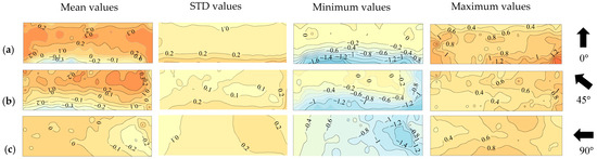 Figure 6 displays the distributions of mean, STD, and peak net pressure coefficients on the solar module. When θ = 0° and 45°, although the wind forces acting on upper and lower surfaces are suction forces, the mean net pressure coefficients are positive in most areas due to the dominance of suction forces on the lower surface compared to those on the upper surface. While at θ = 90°, since the mean pressure coefficients on the upper and lower surfaces exhibit comparable distributions, the resulting mean net pressure coefficients are nearly zero. The distributions of the STD net pressure coefficients are relatively small, suggesting minimal fluctuation. The largest minimum peak net pressure coefficients under the three wind directions are −1.6, −1.2, and −1.2, respectively, observed at the area near the roof eave, leading corner along the wind direction, and near the roof edge. Moreover, the maximum peak net pressure coefficients are significantly larger than that observed on the upper and lower surfaces. The largest maximum peak net pressure coefficient reaches 1.2 in the area near the roof eave and edge under the wind direction of 0°, which is twice that of those observed on the upper surface and three times that of those observed on the lower surface. Furthermore, the largest maximum peak net pressure coefficients in the area near the roof eaves are approximately equal to the largest minimum values.
