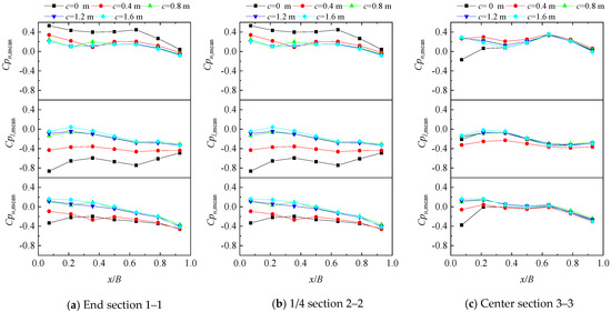 The mean pressure coefficients at the three typical sections on upper and lower surfaces and the resulting mean net pressure coefficients with cornices (c) ranging from 0 m to 1.6 m with an interval of 0.4 m are displayed in Figure 8, in which x represents the horizontal projection distance extending from the measurement tap to the roof eave. Generally, cornice has a significant impact on the mean pressure coefficients of the end section (Section 1–1) while less impact on the mean pressure coefficients of 1/4 (Section 2–2) and center (Section 3–3) sections. For the end section (Section 1–1), when the cornice reaches 0.8 m, the mean pressure coefficients on the upper and lower surfaces transition from negative values to near zero, and the magnitude at the leading edge on the lower surface is reduced by approximately 85%. After reaching 0.8 m, the mean pressure coefficients on the upper and lower surfaces remain almost unchanged. However, the mean net pressure coefficients remain unchanged when the cornice reaches 0.4 m and reduces by approximately 40% at the leading edge. For the 1/4 (Section 2–2) and center (Section 3–3) sections, cornices primarily affect the mean pressure at the leading taps. The mean net pressure coefficients at the leading taps are negative in the absence of cornices but change to positive values when cornices are present.