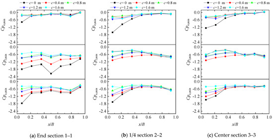 The minimum peak pressure coefficients at three representative sections, both on the upper and lower surfaces, along with the corresponding minimum peak net pressure coefficients in the presence of cornices, are depicted in Figure 10. The influence of cornices on the minimum peak pressure coefficients of one side surface differs from its impact on the minimum peak net pressure coefficients. For both the upper and lower surfaces, the minimum peak pressure coefficients exhibit a gradual reduction as the cornice length increases. This reduction is particularly pronounced for the values observed on the end section (Section 1–1) of the lower surface. However, the impact of cornices on the minimum peak net pressure coefficients is not as pronounced when compared to the effects observed on the values of the individual side surface. By increasing the cornice length from 0 m to 0.4 m, there is a significant reduction in the minimum peak net pressure coefficients at the leading taps of the end (Section 1–1), 1/4 (Section 2–2), and center (Section 3–3) section. The mentioned leading taps demonstrate reductions of approximately 69%, 80%, and 68%, respectively. However, as the cornice length continues to increase beyond the aforementioned values, the minimum peak net pressure coefficients exhibit negligible changes.