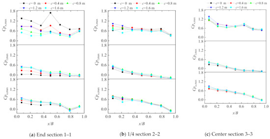 Figure 11 presents the maximum peak pressure coefficients at three representative sections, both on the upper and lower surfaces, along with the corresponding maximum peak net pressure coefficients in the presence of cornices. As depicted, the influence of cornices on the maximum and minimum peak pressure coefficients exhibits noticeable differences. Cornices have a significant impact on the maximum peak pressure coefficients observed at the end section (Section 1–1), while their influence on the values of the 1/4 section (Section 2–2) and center section (Section 3–3) is comparatively less pronounced. The maximum peak net pressure coefficients exhibit a rapid decrease initially and then gradually diminish as the cornice length increases. By increasing the cornice length from 0 m to 0.4 m, the maximum peak net pressure coefficients at the leading taps experience a reduction of approximately 36%. However, the maximum peak pressure coefficients on the upper and lower surfaces of the end section (Section 1–1) exhibit an increasing trend until the cornice height reaches 0.8 m. Beyond this value, further increases in the cornice height do not result in any additional increase in the maximum peak pressure coefficients.