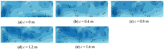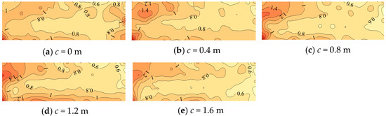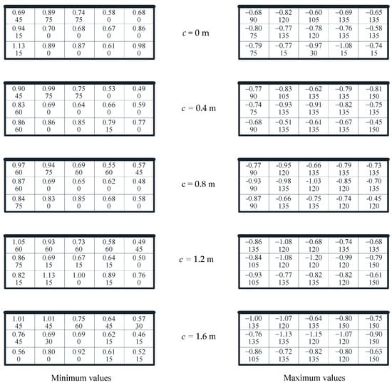 The most critical aspect of wind resistant structural design is the determination of the most unfavorable peak net pressure coefficients. These coefficients represent the envelope values derived from the peak net pressure coefficients across all wind directions. Figure 12 and Figure 13 illustrate the distributions of the most unfavorable minimum and maximum peak net pressure coefficients across all wind directions, taking into account different cornice sizes (c) of 0 m, 0.4 m, 0.8 m, 1.2 m, and 1.6 m. With c = 0 m, larger negative and positive values occur in the zones near the corner and short edge. The minimum and maximum peak net pressure coefficients range from −1.0 to −2.0 and from 0.8 to 2.0, respectively. However, it is worth noting that the larger maximum peak net pressure coefficients primarily occur in the corners. If the corners are eliminated, the distribution of maximum peak net pressure coefficients becomes more uniform.