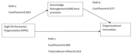 For the analysis of the structural model, we employed the bootstrapping procedure, which involved drawing 5000 random samples (as indicated in Table 6). Table 6 presents data indicating that KM best practices (β = 0.377, p < 0.001) is positively and significantly related to organizational innovation, HPO (β = 0.804, p < 0.001) is positively and significantly related to organizational innovation, and HPO (β = 0.833, p < 0.001) is positively and significantly related to KM best practices. Thus, these findings support our hypotheses (H1, H2, and H3). In addition, H4 is supported, because the HPO construct has a positive and significant relationship with organizational innovation through the mediation role of KM best practices (β = 0.314, p < 0.001). Specifically, the above-mentioned mediation effect is complementary mediation while the indirect effect and the direct effect are both significant and point in the same direction [41]. In a complementary partial mediation, the direct effect (c’) and indirect effect (a*b) point in the same positive direction. It is an often-observed result that a*b and c’ are significant, and a*b × c’ is positive, which indicates that a portion of the effect of the HPO construct on organizational innovation is mediated through KM best practices, whereas the HPO construct still explains a portion of organizational innovation that is independent of KM best practices. This complementary-mediation hypothesis suggests that the intermediate variable explains, or possibly confounds or falsifies, the relationships between the independent and dependent variables.