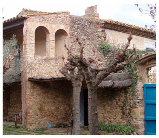 Traditionally, both white and black poplars were used for construction in the area of Baix Empordà, however, Spanish regulations consider black poplar unsuitable for structural use, and it is no longer used for creating roof beams. Therefore, it is very difficult to build using local woods [42]. Instead, the commercially available (and approved) wood comes from the forests and wetlands of Northern Europe, which are better adapted to existing technologies for efficient cutting and harvesting. At the same time, the faster growth rates and smaller dimensions make this timber largely unsuitable for use as structural beams, which has led to its extensive use in laminated timber, that is, wood cut into small pieces of homogeneous length and joined with resins. A higher reliability and predictability are cited as the reasons for the preferred use of laminated timber, and since the preferences of architects are shaped through the effects of social forces (including education, knowledge, budgets, personal liability, and so on), this does not preclude them from intervening creatively to transform existing social structures (cf. [43]) which in turn affect wider attitudes. There is also a belief held (and promoted) that pathologies caused by hygroscopic movements are lower for laminated timbers, as are the risks of biotic attacks.