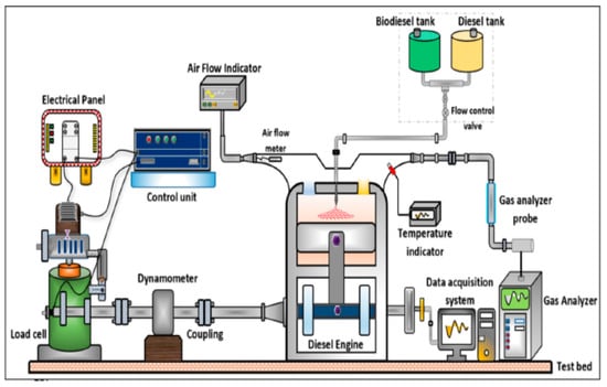 Figure 3 depicts the schematic diagram of the engine setup, while Figure 4 provides a visual representation of the diesel engine test rig setup. Prior to testing the blended fuels, the engine was operated with diesel fuel for approximately 30 min to ensure a stable operating condition. Exhaust emissions from the biodiesel blends were measured at an engine speed of 1500 rpm, a brake power (BP) of 3.7 kW, and a compression ratio (CR) of 17.5:1. The trials were repeated two times, and the middling values of the trial data were considered.