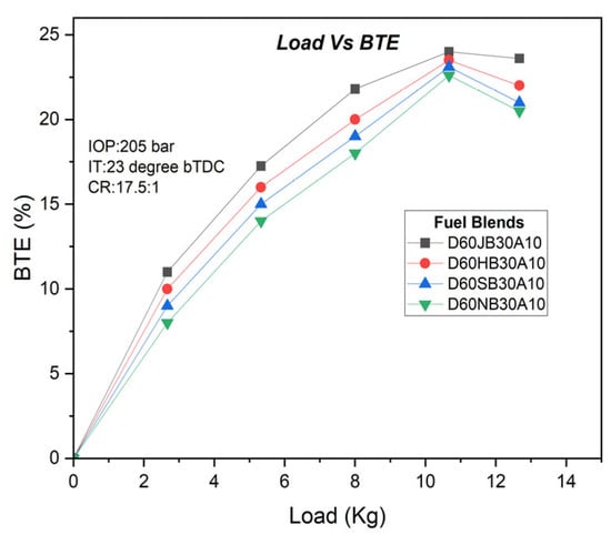 BTE with Engine load for the developed biodiesel blends.